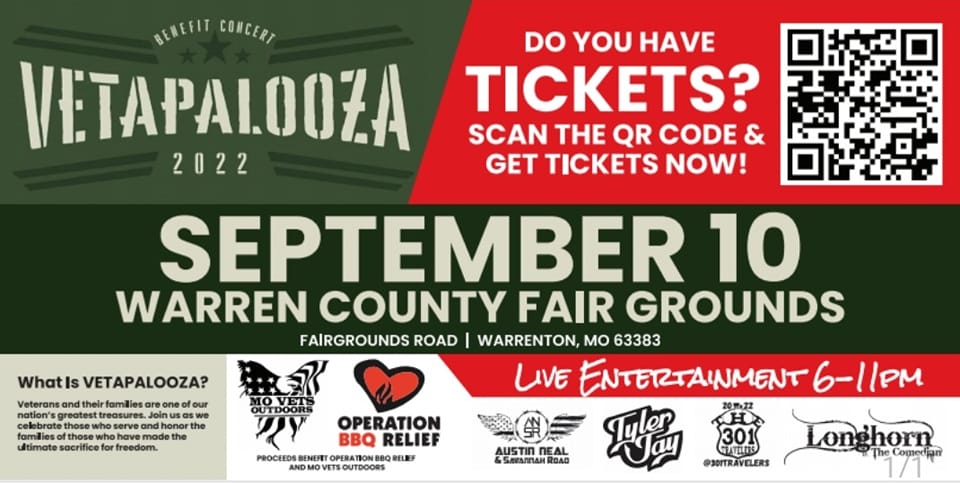 September 10th, Warrenton will host Vetapalooza, a concert for veterans, performed by all veteran bands and comedians benifiting MO Vets Outdoors and Operation BBQ Relief.